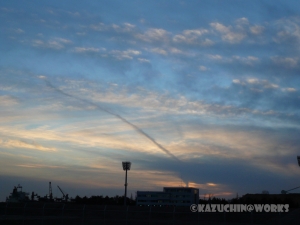 で、その日の夕方、飛行機雲がいいポジションに見えたので